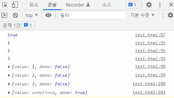 // next 메소드는 value, done 속성을 갖는 Result객체를 리턴한다