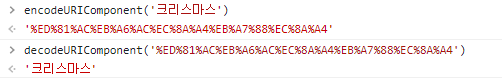 먼저, 브라우저 콘솔창에서 enCodeURIComponent & deCodeURIComponent 를 실행해보자