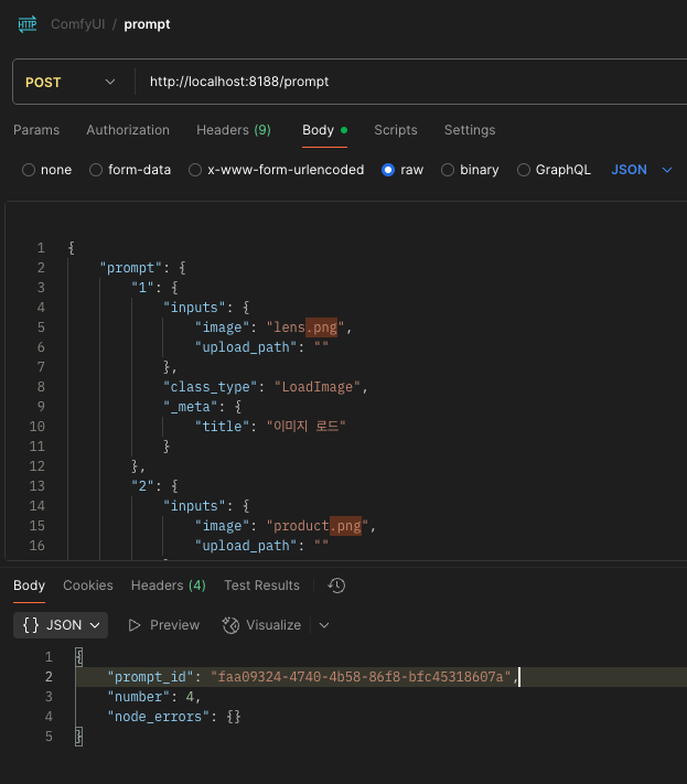 Runpod 자체에 Request 로 workflow 를 담아서 요청 테스트도 가능하다
